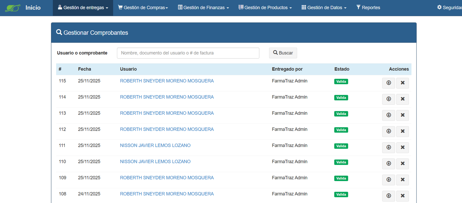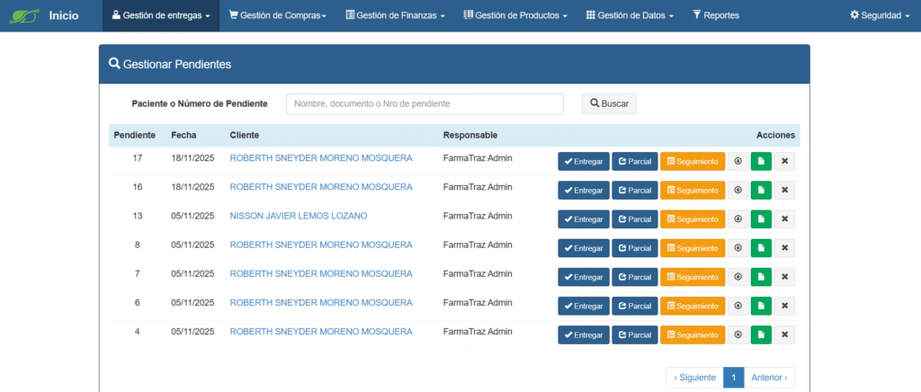 - Controla inventario, lotes y entregas de medicamentos