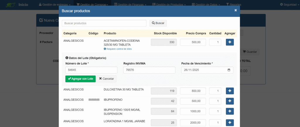 - Control de lotes: número de lote, INVIMA, vencimiento